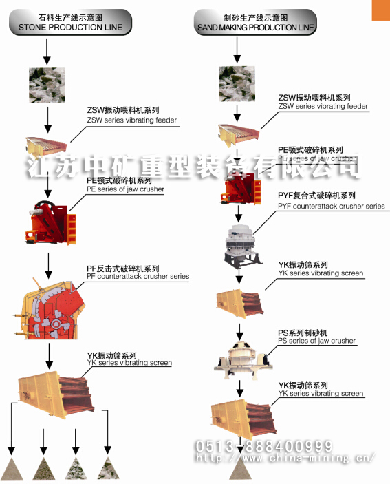 石料生產(chǎn)線主要由振動給料機(jī)、顎式破碎機(jī)、反擊式破碎機(jī)、振動篩、膠帶輸送機(jī)、集中電控等設(shè)備組成。設(shè)計產(chǎn)量一般為50-500噸/小時。為滿足客戶不同的加工需要,可配備圓錐式破碎機(jī)、除塵設(shè)備等。