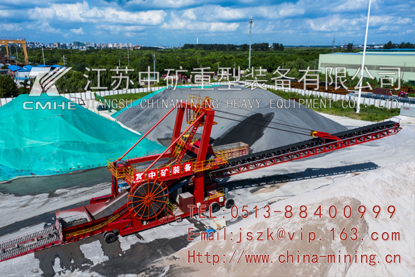 該設備包括行走機構;鏈板進料裝置;帶式輸送機系統(tǒng);臂架俯仰機構;臂架旋轉(zhuǎn)機構;卡車爬坡裝置;液壓系統(tǒng);控制系統(tǒng);配電系統(tǒng)(移動式電站)等。全部系統(tǒng)可以在堆場場地內(nèi)移動,行走機構的行走輪采用重載汽車實心輪胎,無須在堆場內(nèi)布置固定軌道,增加堆場利用率;進料裝置與輸送懸臂集為一體,二者均安裝于一個公共底盤之上,構成一體式移動堆高機;臂架俯仰機構采用鋼絲繩俯仰形式,臂架旋轉(zhuǎn)機構采用回轉(zhuǎn)減速電機和回轉(zhuǎn)軸承,配電系統(tǒng)采用發(fā)電機組和電纜卷筒供電,整個系統(tǒng)具有完整地獨立性。