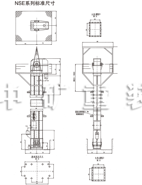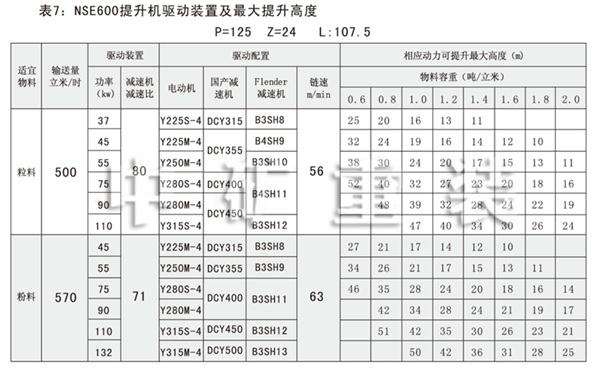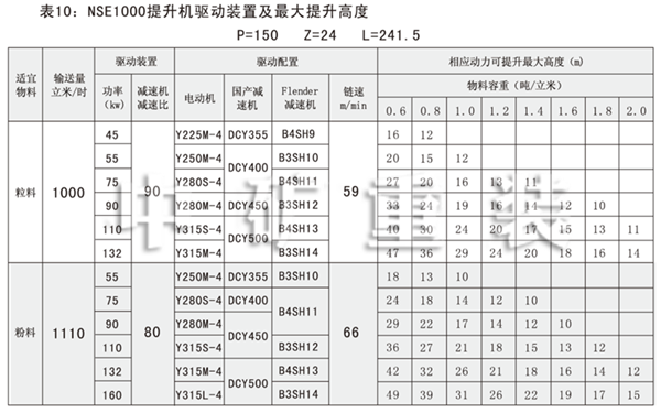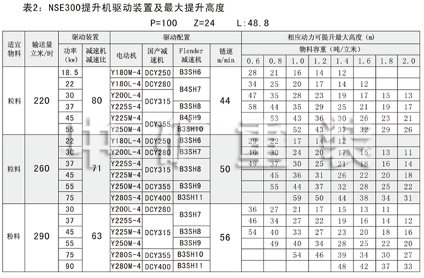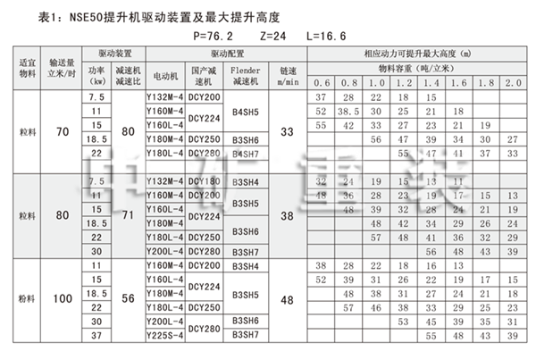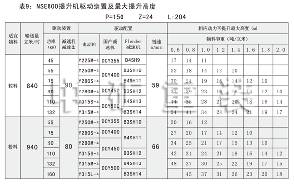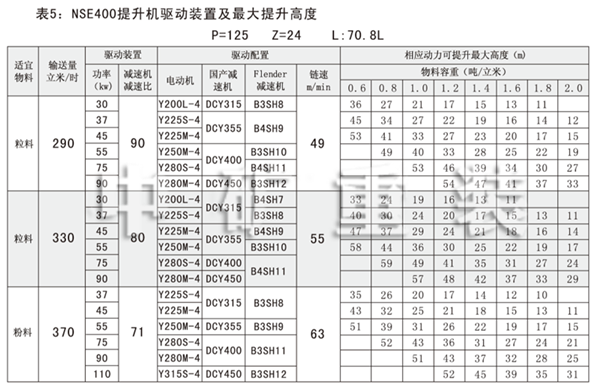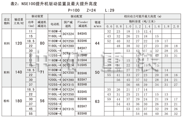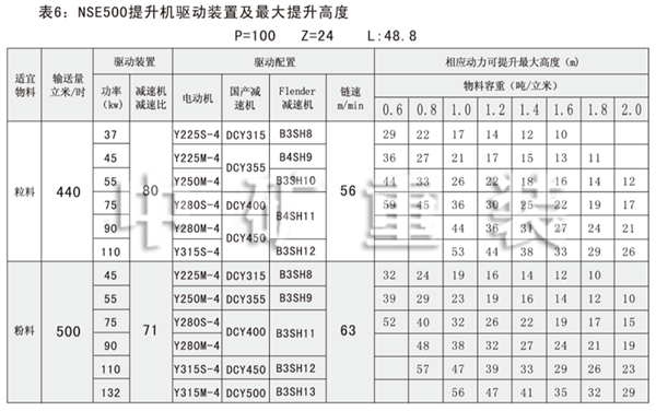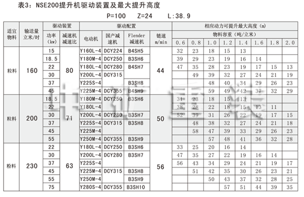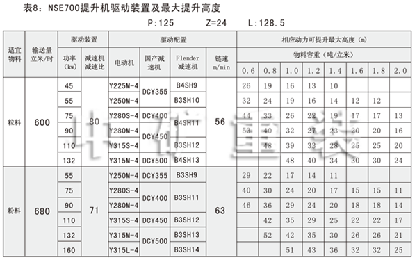 NSE系列高速板鏈斗式提升機共有九種基本型號:NSE100、NSE200、NSE300、NSE400、NSE500、NSE600、NSE700、NSE800、NSE1000,每種型號根據(jù)輸送物料的不同,選擇不同的提升速度,提升速度≤70m/min,提升高度65m。另外,中礦公司還可根據(jù)用戶要求輸送量介于上述型號之間的擴展型號。