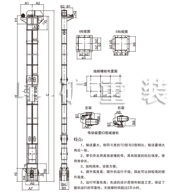 TD型斗式提升機(jī)適用于垂直輸送粉狀、粒狀,及小塊狀的磨琢性較小的散狀材料,如糧食、煤。水泥、碎礦石等,提升高度40m,其特點(diǎn)為結(jié)構(gòu)簡(jiǎn)單,運(yùn)行平穩(wěn),挖取式裝料,離心式卸料,物料溫度普通膠帶不超過(guò)60℃,夾鋼絲膠帶可達(dá)80℃,耐熱膠帶可達(dá)120℃,與傳統(tǒng)D型斗提升機(jī)相比,輸送效率高,料斗型式多,應(yīng)優(yōu)先選用。