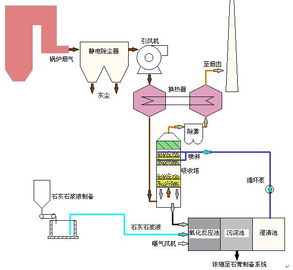 一、濕式石灰(石)/石膏法煙氣脫硫技術(shù),其工藝流程圖如上: 鍋爐煙氣在吸收塔內(nèi)與石灰(石)粉形成的漿液進(jìn)行逆流接觸反應(yīng)。吸收塔下段低PH值有利于氧氣和石灰石溶解,上段較高PH值有利于吸收反應(yīng),提高脫硫效率。